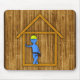 Para cualquier manitas, trabajador de construcción, o carpintero. Trabajador de construcción ilustrado del dibujo animado con la correa del casco y de la herramienta dentro del marco para una casa.