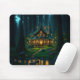 Almohadilla del ratón de un tranquilo castillo de la región de Tolkienesque en un bosque sereno, junto a un estanque al atardecer. Las luces de los hados iluminan el entorno. Imagen hecha con Leonardo.ai.