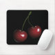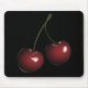 Un par de cerezas rojas, jugosas, deliciosas en un fondo del negro plano.