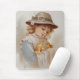 Maravilloso ilustracion vintage de una joven chica que lleva un gorra con flores de margarita y acariciando un puñado de patos bebé con su delantal.