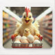 Una gallina alegre y su polluelo empujan un carrito de compras lleno de huevos por el pasillo de una tienda
