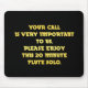 Un mensaje humorístico está escrito en negrita en amarillo contra un fondo negro. Dice: "Su llamada es muy importante para nosotros. Por favor, disfruta de este solo de flauta de 20 minutos".
