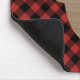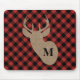Un mousepad que ofrece un modelo rojo y negro de la tela escocesa de la herencia (búfalo). El centro ofrece un ilustracion inspirado arpillera de una silueta de la cabeza de 8 del punto ciervos del dólar. Personalice la inicial en ciervos.