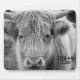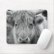 Un cojín de ratón con una imagen blanco y negro de una de las vacas famosas de la montaña de Escocia.