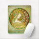 Cojín de ratón del laurel de Alfonso Mucha. Poster de la litografía a partir de 1901. El artista checo Alfonso Mucha era renombrado para sus trabajos alegóricos. El laurel es una pintura que ofrece a un brunette joven hermoso cubierto en hiedra. Ella mira hacia adelante en perfil y lleva un rosa amarillo en su pecho. El poster complejo se adorna con las hojas, las tejas y las flechas de la hiedra que entrelazan. Un gran regalo para las fans de Mucha, de los posters del nouveau del arte, y de las impresiones del vintage.