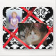 Cojín de ratón de encargo precioso hecho en una mirada francesa del tablón de anuncios, con un fondo del damasco blanco y negro, y cintas y botones rojos. Personalice este gran mousepad con sus fotografías preferidas, o haga uno como regalo. Grande para el hogar o su oficina cada uno la amará.