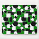 Esta almohadilla de ratón tiene un diseño Bauhaus de triángulos, círculos, rectángulos y pentagones en blanco y negro sobre un campo de verde.