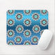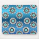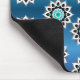 Una vibrante alfombrilla de ratón con un patrón de mandala repetido en azul verde, blanco y negro sobre un fondo de gradiente azul suave. Este diseño simétrico inspirado en flores añade un toque refrescante y moderno boho a tu espacio de trabajo mientras proporciona una superficie suave y elegante para el uso diario.