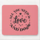 Alfombrilla para ratón con tema “Amor y Perros”. : Una alfombrilla para ratón con tema “Amor y Perros” que presenta un gráfico circular blanco con la frase “TODO LO QUE NECESITAS ES AMOR Y PERROS”, acentuado por corazones y huellas de patas. Esta alfombrilla para ratón con tema “Amor y Perros” atrae a los entusiastas de los perros y promueve el amor como un sentimiento esencial.