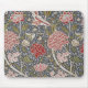 A mouse pad with the floral textile pattern by William Morris (1834-1896), Cray (c. 1883). Pink and red wildflowers on a dark gray background.