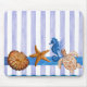 Diseño original de Sandra Gale, pintado en color agua, con estrellas de pescado, caballo de mar, tortuga y conchas sobre un fondo de rayas azules translúcidas verticales. Gran diseño para el verano, casas de playa, bungalows o para todo aquel que ame la playa, el océano o el pescado.
