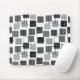 Esta almohadilla del ratón tiene un diseño geométrico de cuadrados en negro y tonos grises dispersos alrededor con sus contornos.