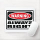 Advirtiendo Mousepad SIEMPRE DERECHO usted puede modificar para requisitos particulares en www.WarningSignShirts.com y ofrece una señal de peligro roja y negra y SIEMPRE A LA DERECHA en letras negras intrépidas de advertir el mundo. Usted puede también modificar su propia señal de peligro para requisitos particulares Mousepad con el texto que usted quiere.