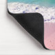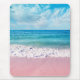 Un mousepad tropical con una foto de un paisaje marino con olas de océano azul turquesa, arena rosa y un cielo azul acuático.