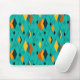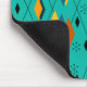 Esta almohadilla de ratón tiene un diseño atómico moderno de diamantes de mediados de siglo, y estallidos en un campo de turquesa.