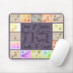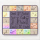 Una almohadilla de ratón única con un borde de mosaico, cada mosaico contiene un dibujo antiguo de diferentes partes del cuerpo. Ojos, oídos, manos y pies están entre los bocetos. El interior está repleto de palabras sobre dibujo, dibujo y pintura, junto con las herramientas que todo artista conoce. Pluma, lápiz, tiza, tinta, pintura y pastel son algunas de las palabras que se usan en un tipo de letra divertido.