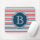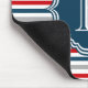 Diseño de temática náutica con decoración monográfica sobre fondo de rayas azules, blancas, rojas y grises