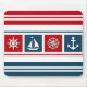 Diseño náutico con decoración de velero, ancla, brújula y rueda de vela sobre fondo a rayas