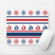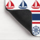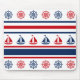 Diseño náutico con velero y decoración de brújula sobre fondo rayado rojo, azul y blanco