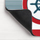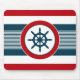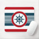 Diseño náutico con decoración de ruedas de vela en forma redonda sobre fondo rayado azul, rojo y blanco