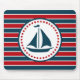 Diseño náutico con decoración de velero en forma redonda con estrellas en fondo rayado rojo, azul y blanco