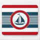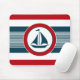 Diseño náutico con decoración de velero en forma redonda sobre fondo rayado azul, rojo y blanco