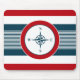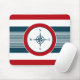 Diseño náutico con decoración de brújula en forma redonda sobre fondo rayado azul, rojo y blanco