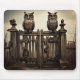 Se trata de esculturas de búho esculpidas que adornan una puerta rústica de madera, creando una entrada cautivadora. Las características detalladas de los búhos y su mirada penetrante añaden un elemento de mística y encanto a la escena