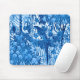 Almohadilla del ratón en un Ilustracion basado en el patrón 'Macaw' de Walter Crane para los estudios de William Morris. Un macaw/loro salvaje en un entorno de selva exótica - realzado digitalmente y colorido en azul índigo y blanco