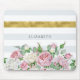 Este hermoso tabique floral rosa muestra una elegancia moderna, con románticas rosas rosadas en un marco de moda, con un suave estampado de rayas blancas y grises adornado con una franja de oro purpurinoso. Personalice este diseño de flores y rayas femeninas añadiendo su nombre. El oro es una imagen plana impresa, NO un purpurina de oro.
