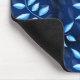 Mousepad de planta azul con un patrón botánico hecho de un ilustracion vectorial de bonito de un motivo floral de una planta con hojas azules y correa blanca sobre ellos bellamente arreglado sobre un patrón ligeramente transparente de la misma baldosa sobre fondo azul oscuro.
