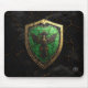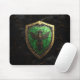 Alfombrilla de ratón majestuosa con un águila dorada sobre un escudo de cristal verde esmeralda brillante. Cuenta con filigrana ornamentada y texturas agrietadas realistas en una superficie de mármol negro con vetas doradas premium. Diseñado para amantes de la fantasía y configuraciones de escritorio de juegos con temática natural.