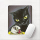 Gato negro magnífico y pequeño ratón que mordiscan en un arándano. De la pintura en colores pastel del aceite original por el enlace de Tania