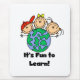 La figura niños de tres palillos rodea un globo del mundo y el texto lo lee "es diversión a aprender!" ¡en las camisetas temáticas de la escuela, las tarjetas, las tazas, los pegatinas, los botones, y el otro engranaje!