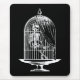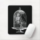 Un collage de imágenes vintage forma una fantasía gótica de un pequeño esqueleto con alas y una corona de princesa sentada dentro de una jaula empapada.