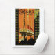 Poster de la Línea de Cunard Vintage promocionando sus servicios transatlánticos y sus transatlánticos de cuatro pilas de trineo oceánico de principios del siglo XX enmarcado por rascacielos de Nueva York.