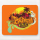 Un ilustracion divertido de una escena playera con bailes, palmeras, el sol y una playa.