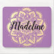 Una almohadilla de ratón con un bonito diseño de flores de manala de color dorado sobre un fondo morado con un nombre personalizado personalizado que se puede quitar. Esta moda y elegante almohadilla de ratón es perfecta para una mujer o un chica adolescente a quien le gustan los mandalas florales mínimos y el color rosado.