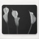 La elegante vida de Calla Lilies. La foto en blanco y negro de las flores es simplemente una hermosa fotografía. El fondo oscuro detrás de la liga hace que la decoración floral sea muy bonita. Esta es una gran fotografía floral para el diseño de una almohadilla de ratón.