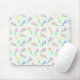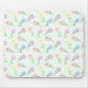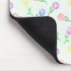 Esta almohadilla de ratón tiene un diseño moderno de mediados de siglo de círculos y partes de círculo hechas para parecerse a flores con tallos hechos por líneas continuas, repitiéndose a lo largo del diseño.