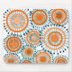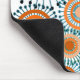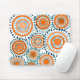 Esta almohadilla del ratón tiene un diseño de anillos y círculos en tonos de naranja con líneas verde azuladas cruzando detrás de ellos formando flores en un campo de blanco.