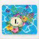 Un diseño tan hermoso y colorido de flores tropicales hawaianas de hibiscus, flor, frangipani, hojas de palma y mariposas. El diseño también cuenta con una corona ornamental redonda de follaje y piñas con un marco decorativo de oro falso. Personalizar con tu propia inicial. Diseño gráfico sobre un salpicón de agua azul texturado fondo.