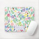Floral with floating foliage, pretty stylized flowers, leaves, berries, acorns and accent polka dots in shades of green, blue, pink, purple and yellow with accents in orange, red and brown. Set on a white background. Personalize with your name or message in purple font on a white nameplate framed in purple.