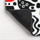 Una almohadilla de ratón con un diseño abstracto inusual compuesto de formas surrealistas extrañas en rojo y negro. Inspirado en un diseño retro-moderno.