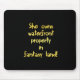 El texto amarillo brillante en un fondo negro afirma humorísticamente, "¡Ella es dueña de una propiedad frente al mar en tierra de fantasía!". El chiste sugiere que ella está fantaseando.