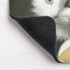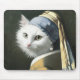 Un gato blanco vestido con un velo azul y amarillo y un anillo de perlas, con el estilo de un retrato famoso