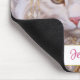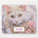 Una almohadilla de ratón con un ilustracion encantador. Un gato blanco de pelo largo que parece regal y elegante. Rodeado de flores rosas, oro y joyas de diamantes.
