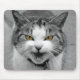Una fotografía blanco y negro de un gato con una expresión muy enojada en ella es cara. Los ojos se han cubierto con un tinte del oro para hacer la expresión aún más dramática.