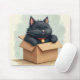 Un gato negro esponjoso con un collar rojo y una campana dorada se esconde cómodamente dentro de una caja de cartón abierta