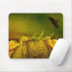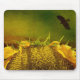 Un halcón de cola roja se dispara sobre un campo de girasoles. La puesta de sol detrás de ella. Este compuesto computacional tiene una calidad de sueño.